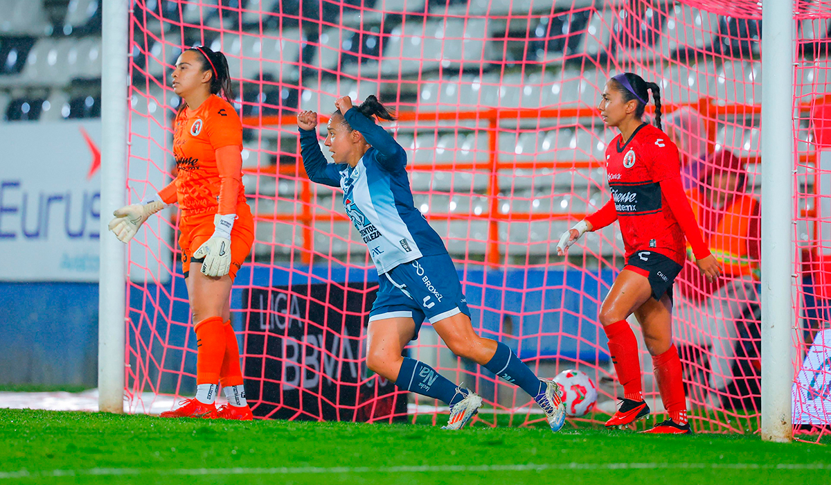 Luego de los primeros instantes en que la escuadra hidalguense dominaba las acciones con poca profundidad y la salida por lesión de la arquera de Tijuana: Emily Alvarado, fueron las visitantes las que se pusieron al frente en el marcador tras en un desborde por derecha, que al dar continuidad por el centro encontró rematadora en los pies de Aisha Solórzano para poner el 0-1.