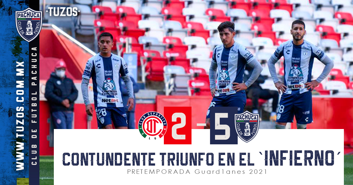 TOLUCA, EDO. DE MÉX.- Una actuación redonda fue la que dieron los Tuzos del Pachuca en su último encuentro del año rumbo al arranque del Guad1anes 2021, al vencer por categórico marcador de 5 goles por 2 a los Diablos Rojos del Toluca en el Estadio Nemesio Díez. Este segundo duelo de pretemporada, disputado en la capital mexiquense constó de 2 enfrentamientos: 2 de 45 minutos con titulares en la cancha, y 2 más de 30 minutos con cuadros alternos.